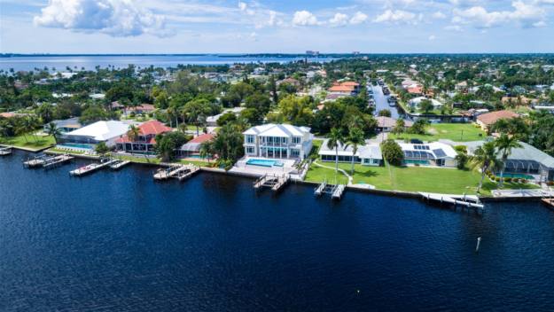 Nur einen Steinwurf vom Yachthafen von Cape Harbour entfernt befindet sich die Villa in begehrter Lage an einer Kanalkreuzung südwestlich der Cape Coral Parkways.