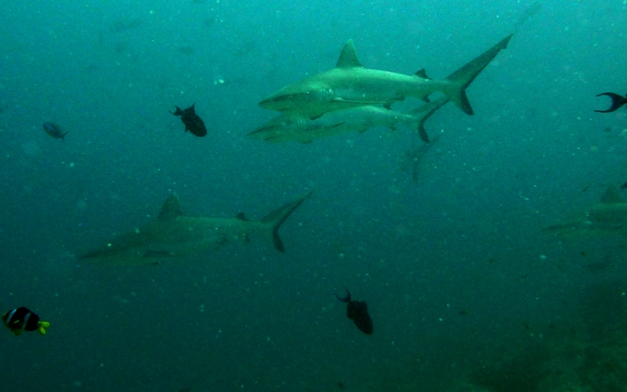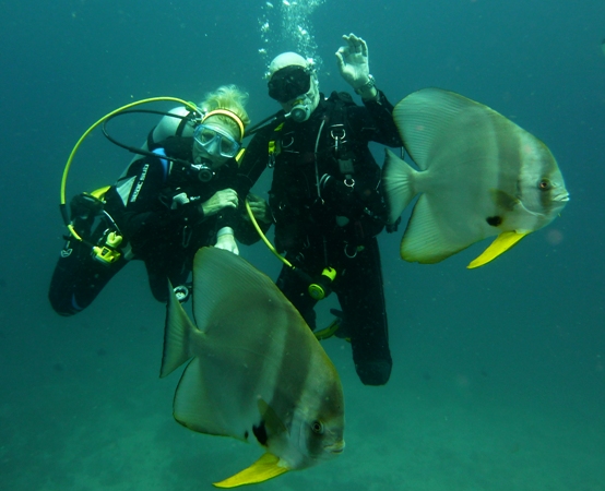 Wir wünschen Rainer alles Gute zum Geburtstag!!! :yes: Die Haie und Fledermausfische von “Sharks & More” kamen auch zum gratulieren. B) Später haben wir mit Champagner auf dem Boot angestossen. So lässt es sich Leben…!!! 😀