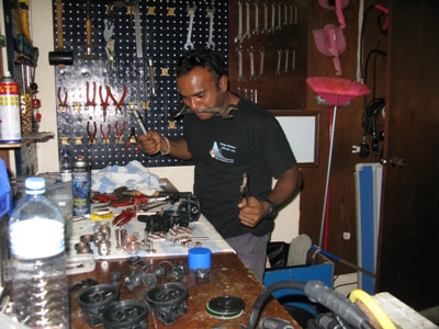 Zwei mal im Jahr wird bei uns die Werkstatt zur Servicestation umfunktioniert. Dann werden alle unsere Atemregler komplett durchgecheckt, damit unsere Taucher auch immer schön “schnaufen” können. Twice a year our workstation suddenly became a servicestation. Thats the time when our regulators get completly checked, that our diver can breath nice :).